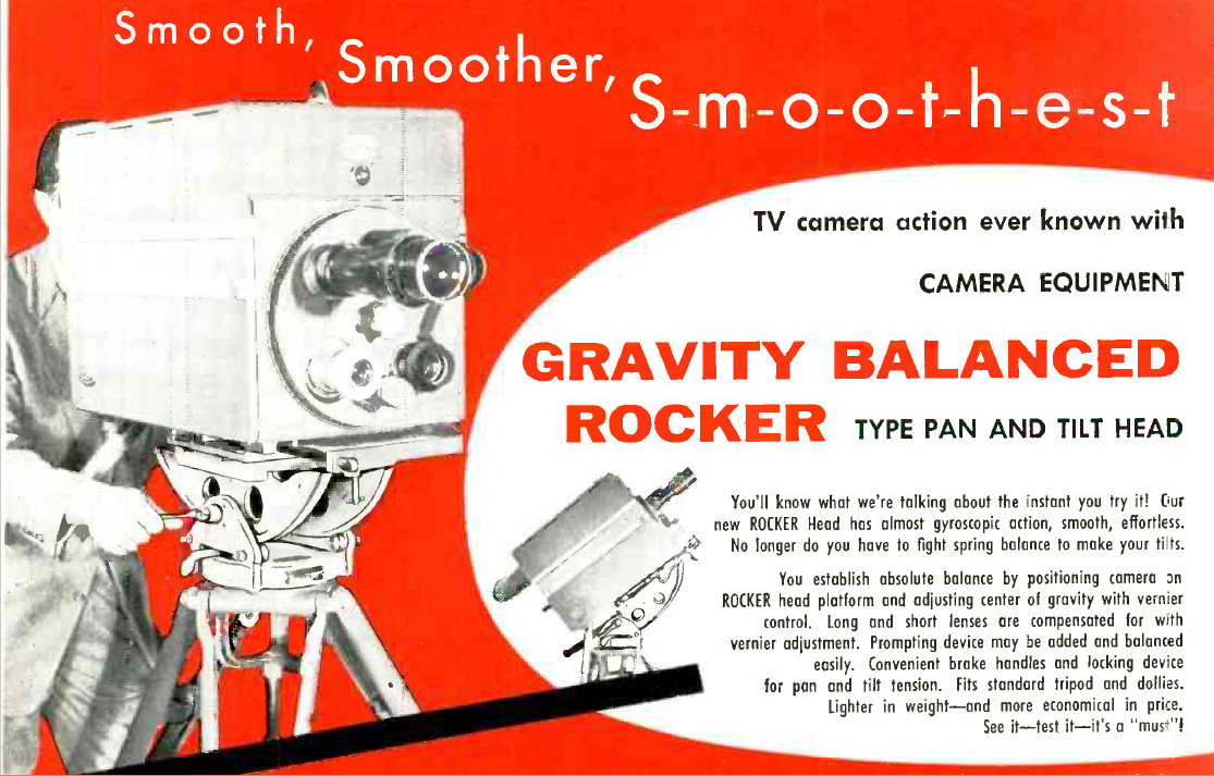 Het Omroepmuseum beschikt ook over een exemplaar, wellicht geleverd met de RCA-camera’s in 1958. De tekeningen uit een octrooi van de maker Houston Fearless geven een goed idee hoe hij er uit ziet. De kop heeft geen handwiel maar wel een stick. Op zicht is het segment met de rolletjes zo’n 90° lang, vandaar de benaming kwadrantkop, en de camera kan schommelen zoals een wieg …… Voor de zware en brede kleurencamera’s van die periode was er een extra breed model (foto RCA 1961).